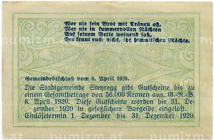 Купить 50 геллеров 1920 года Австрия — Штайрег (Нотгельд) по привлекательной цене можно в нашем интернет-магазине — Вам достаточно оформить заказ на сайте. Все монеты, представленные в каталоге, находятся в наличии на нашем складе.