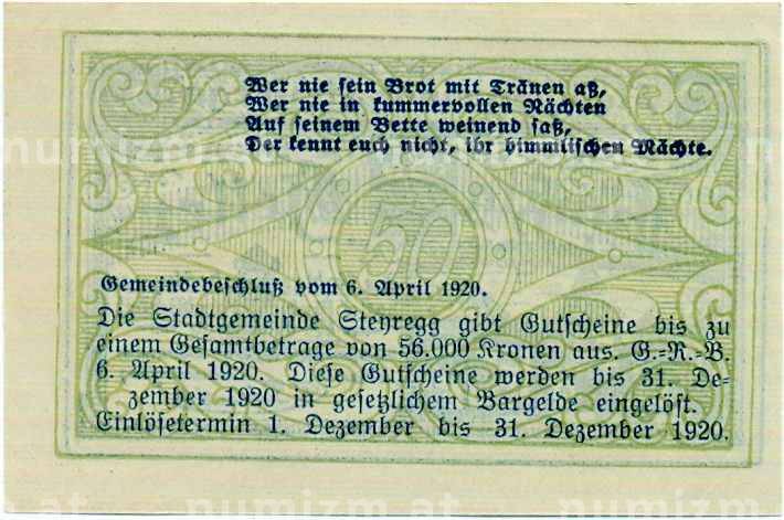 Купить 50 геллеров 1920 года Австрия — Штайрег (Нотгельд) по привлекательной цене можно в нашем интернет-магазине — Вам достаточно оформить заказ на сайте. Все монеты, представленные в каталоге, находятся в наличии на нашем складе.