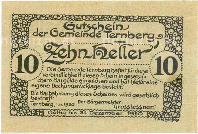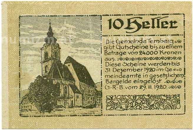 Купить 10 геллеров 1920 года Австрия — Коммуна Тернберг (Нотгельд) по привлекательной цене можно в нашем интернет-магазине — Вам достаточно оформить заказ на сайте. Все монеты, представленные в каталоге, находятся в наличии на нашем складе.