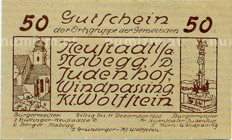 Купить 50 геллеров 1920 года Австрия — Коммуна Нойштадтль-на-Дунае (Нотгельд) по привлекательной цене можно в нашем интернет-магазине — Вам достаточно оформить заказ на сайте. Все монеты, представленные в каталоге, находятся в наличии на нашем складе.