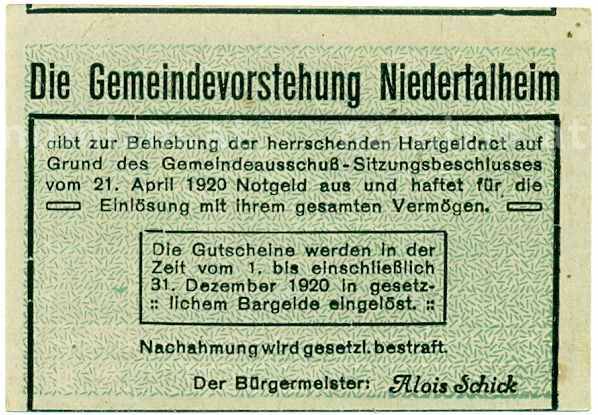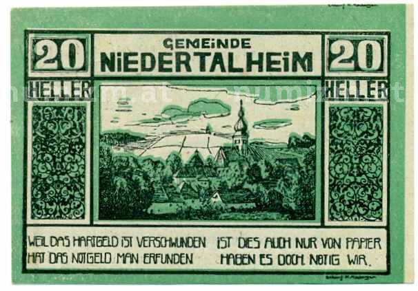 Банкнота 20 геллеров 1920 года Австрия — Нидерергайм (Нотгельд) (Артикул: B2-14260): подробные характеристики, качественные фотографии в высоком разрешении, низкая цена.