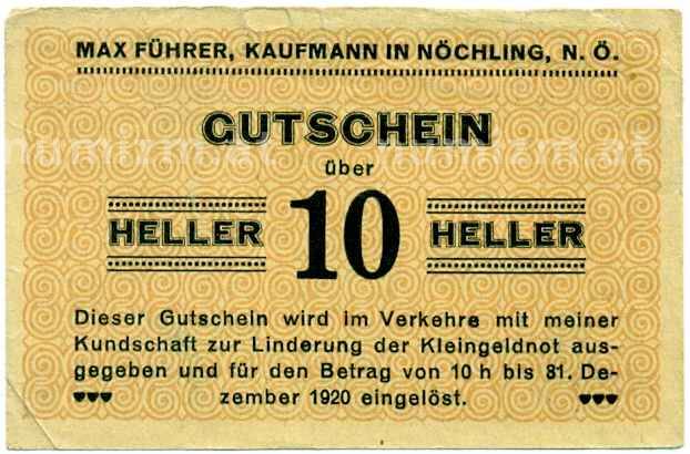 Купить 10 геллеров 1920 года Австрия — Коммуна Нехлинг (Нотгельд) по привлекательной цене можно в нашем интернет-магазине — Вам достаточно оформить заказ на сайте. Все монеты, представленные в каталоге, находятся в наличии на нашем складе.