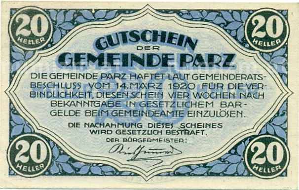 Купить 20 геллеров 1920 года Австрия — Парз (Нотгельд) по привлекательной цене можно в нашем интернет-магазине — Вам достаточно оформить заказ на сайте. Все монеты, представленные в каталоге, находятся в наличии на нашем складе.