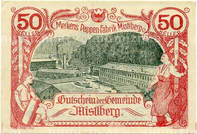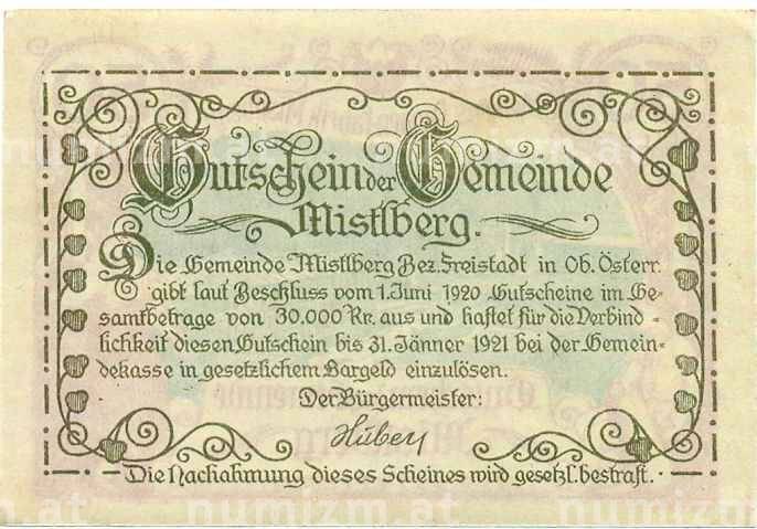 Банкнота 50 геллеров 1920 года Австрия — Мистльберг (Нотгельд) (Артикул: B2-14466): подробные характеристики, качественные фотографии в высоком разрешении, низкая цена.