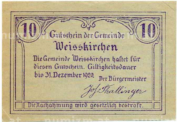 Банкнота 10 геллеров 1920 года Австрия — Коммуа Вайсенкирхен-ин-дер-Вахау (Нотгельд) (Артикул: B2-14531): подробные характеристики, качественные фотографии в высоком разрешении, низкая цена.