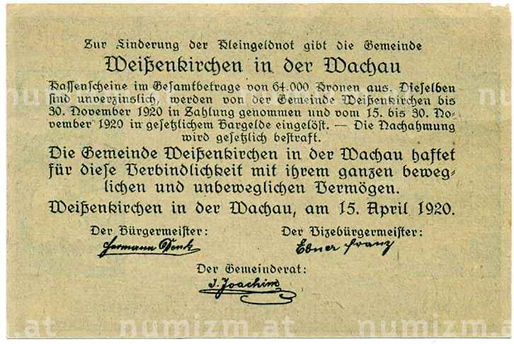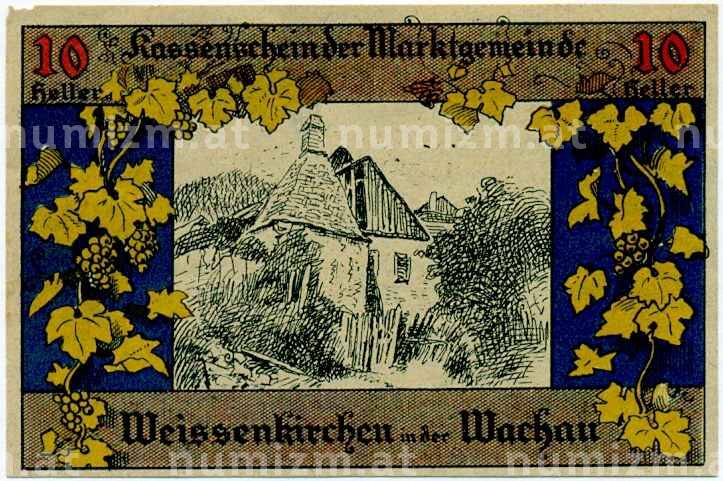 Банкнота 10 геллеров 1920 года Австрия — Коммуа Вайсенкирхен-ин-дер-Вахау (Нотгельд) (Артикул: B2-14536): подробные характеристики, качественные фотографии в высоком разрешении, низкая цена.