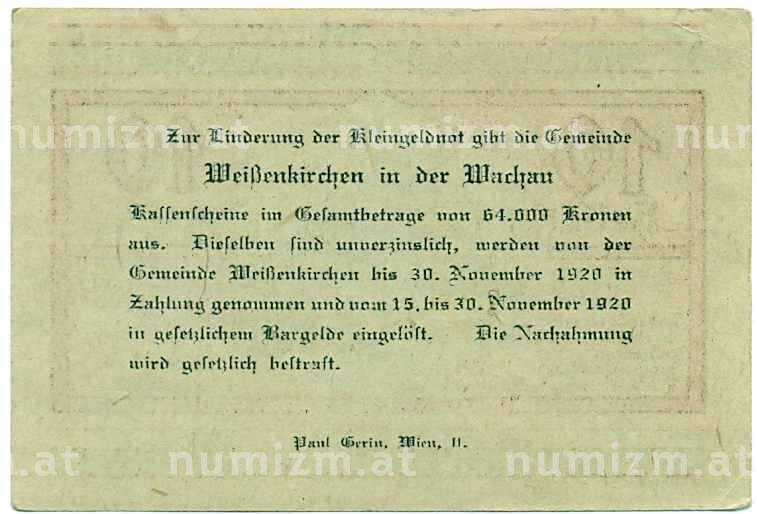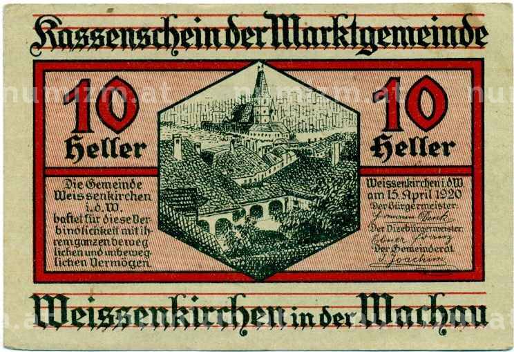 Банкнота 10 геллеров 1920 года Австрия — Коммуа Вайсенкирхен-ин-дер-Вахау (Нотгельд) (Артикул: B2-14541): подробные характеристики, качественные фотографии в высоком разрешении, низкая цена.