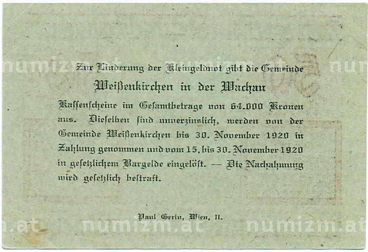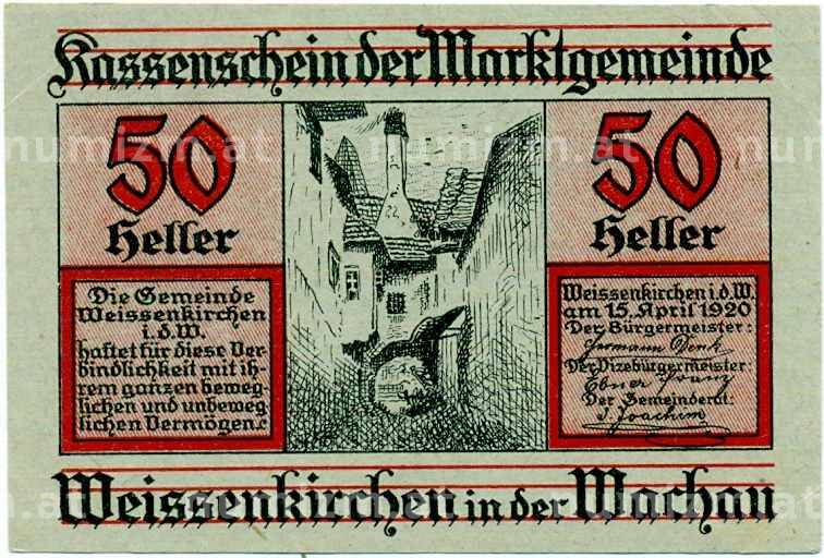 Банкнота 50 геллеров 1920 года Австрия — Коммуа Вайсенкирхен-ин-дер-Вахау (Нотгельд) (Артикул: B2-14549): подробные характеристики, качественные фотографии в высоком разрешении, низкая цена.