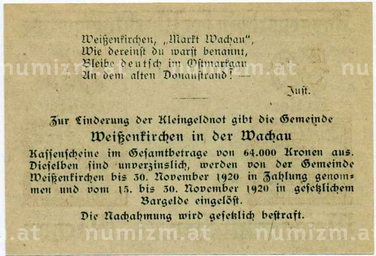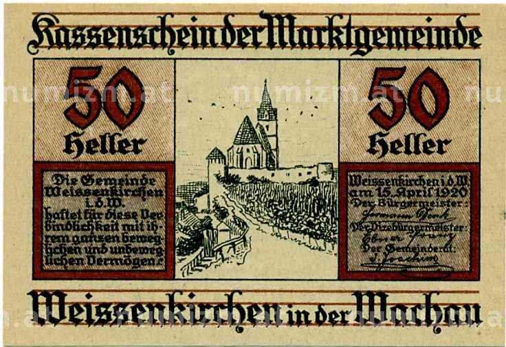 Банкнота 50 геллеров 1920 года Австрия — Коммуа Вайсенкирхен-ин-дер-Вахау (Нотгельд) (Артикул: B2-14551): подробные характеристики, качественные фотографии в высоком разрешении, низкая цена.