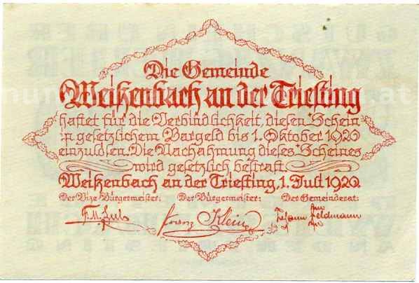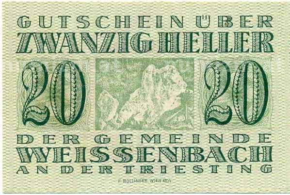 Купить 20 геллеров 1920 года Австрия — Коммуа Вайсенбах-ан-дер-Тристинг (Нотгельд) по привлекательной цене можно в нашем интернет-магазине — Вам достаточно оформить заказ на сайте. Все монеты, представленные в каталоге, находятся в наличии на нашем складе.