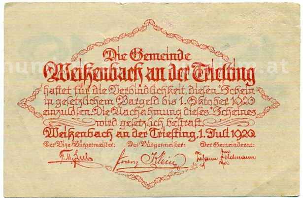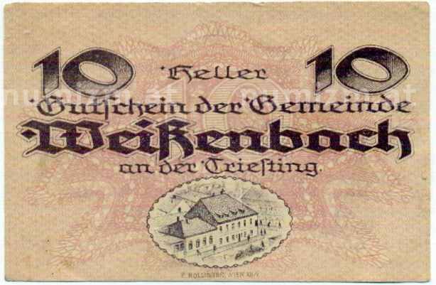 Купить 10 геллеров 1920 года Австрия — Коммуа Вайсенбах-ан-дер-Тристинг (Нотгельд) по привлекательной цене можно в нашем интернет-магазине — Вам достаточно оформить заказ на сайте. Все монеты, представленные в каталоге, находятся в наличии на нашем складе.