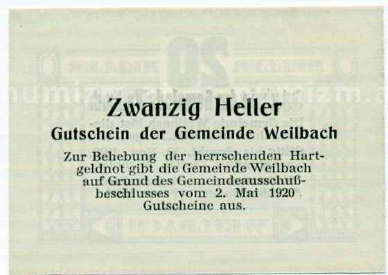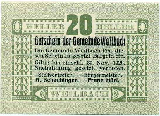 Купить 20 геллеров 1920 года Австрия — Вайльбах (Нотгельд) по привлекательной цене можно в нашем интернет-магазине — Вам достаточно оформить заказ на сайте. Все монеты, представленные в каталоге, находятся в наличии на нашем складе.