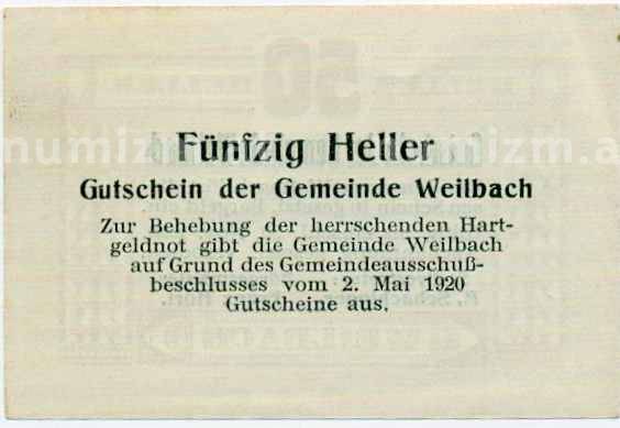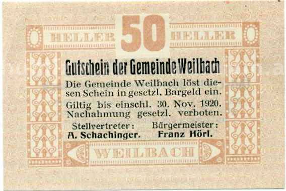 Купить 50 геллеров 1920 года Австрия — Вайльбах (Нотгельд) по привлекательной цене можно в нашем интернет-магазине — Вам достаточно оформить заказ на сайте. Все монеты, представленные в каталоге, находятся в наличии на нашем складе.