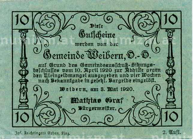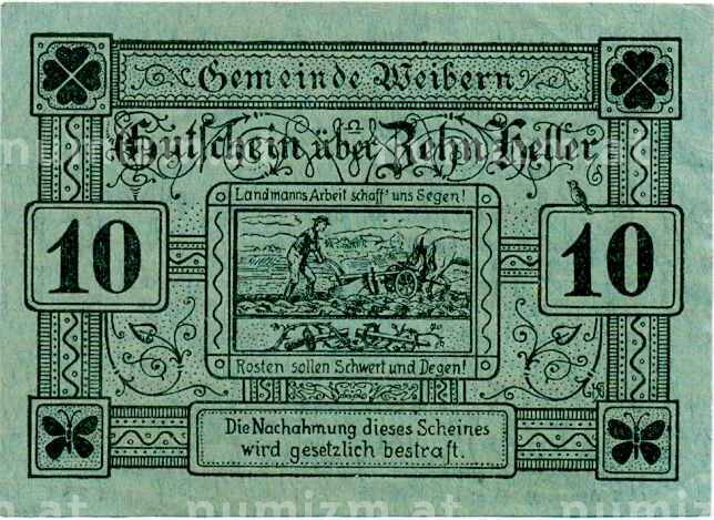 Банкнота 10 геллеров 1920 года Австрия — Коммуна Вайберн (Нотгельд) (Артикул: B2-14585): подробные характеристики, качественные фотографии в высоком разрешении, низкая цена.