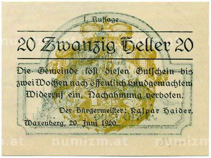 Купить 20 геллеров 1920 года Австрия — Ваксенберг (Нотгельд) по привлекательной цене можно в нашем интернет-магазине — Вам достаточно оформить заказ на сайте. Все монеты, представленные в каталоге, находятся в наличии на нашем складе.
