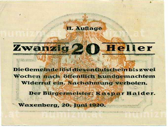 Банкнота 20 геллеров 1920 года Австрия — Ваксенберг (Нотгельд) (Артикул: B2-14593): подробные характеристики, качественные фотографии в высоком разрешении, низкая цена.