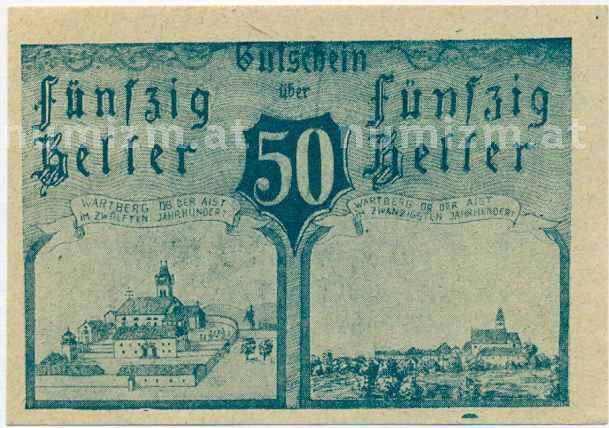 Купить 50 геллеров 1920 года Австрия — Коммуна Вартберг-об-дер-Айст (Нотгельд) по привлекательной цене можно в нашем интернет-магазине — Вам достаточно оформить заказ на сайте. Все монеты, представленные в каталоге, находятся в наличии на нашем складе.