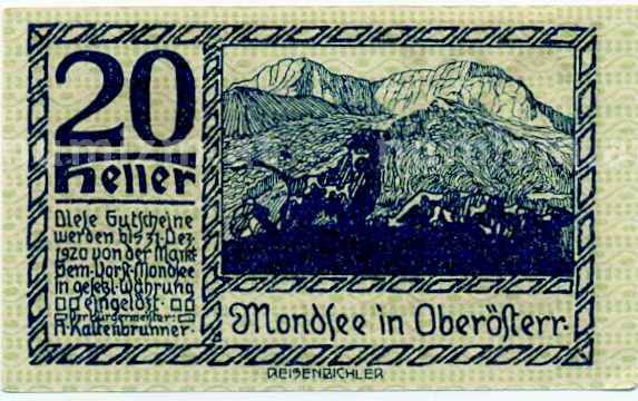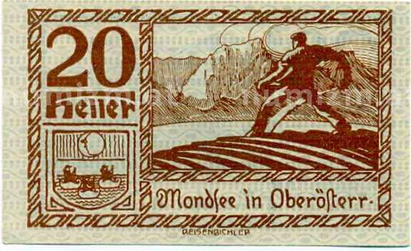 Банкнота 20 геллеров 1920 года Австрия — Мондзее (Нотгельд) (Артикул: B2-14661): подробные характеристики, качественные фотографии в высоком разрешении, низкая цена.