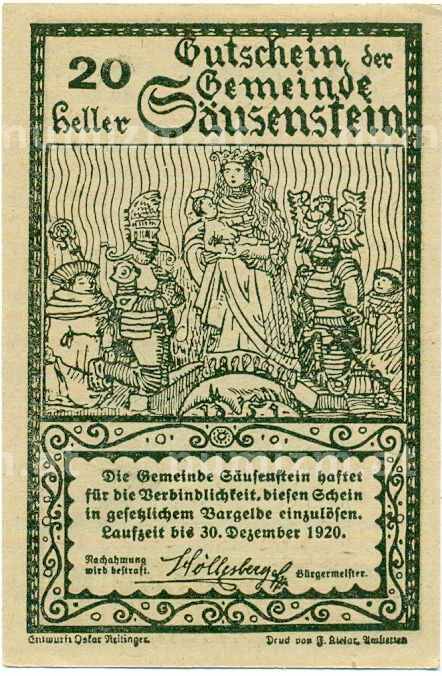 Банкнота 20 геллеров 1920 года Австрия — Заусенштайн (Нотгельд) (Артикул: B2-14716): подробные характеристики, качественные фотографии в высоком разрешении, низкая цена.