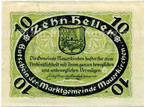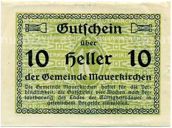 Купить 10 геллеров 1920 года Австрия — Коммуна Мауэркирхен (Нотгельд) по привлекательной цене можно в нашем интернет-магазине — Вам достаточно оформить заказ на сайте. Все монеты, представленные в каталоге, находятся в наличии на нашем складе.