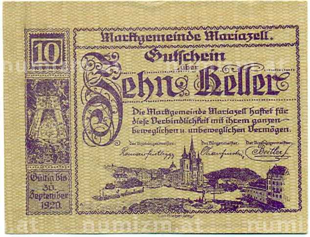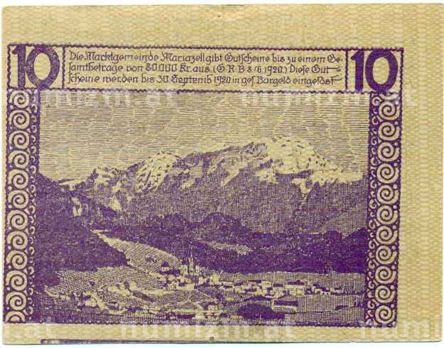 Банкнота 10 геллеров 1920 года Австрия — Мариацелль (Нотгельд) (Артикул: B2-14746): подробные характеристики, качественные фотографии в высоком разрешении, низкая цена.