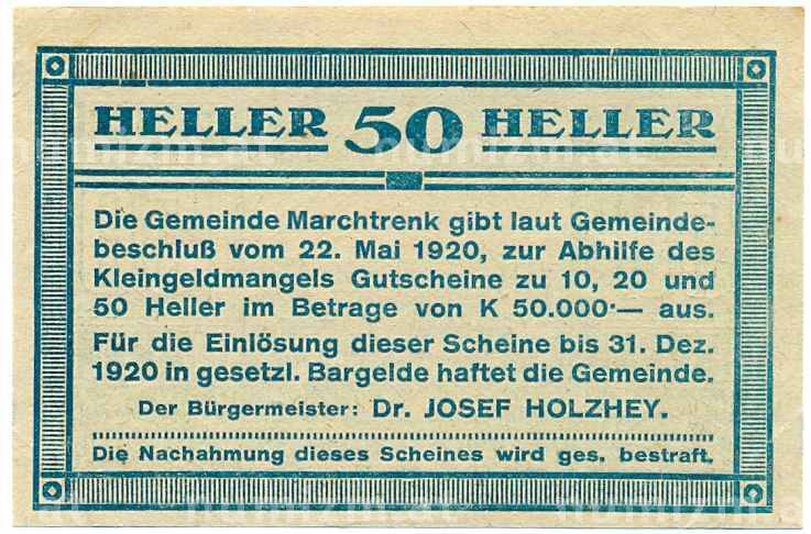Купить 50 геллеров 1920 года Австрия — Мархтренк (Нотгельд) по привлекательной цене можно в нашем интернет-магазине — Вам достаточно оформить заказ на сайте. Все монеты, представленные в каталоге, находятся в наличии на нашем складе.