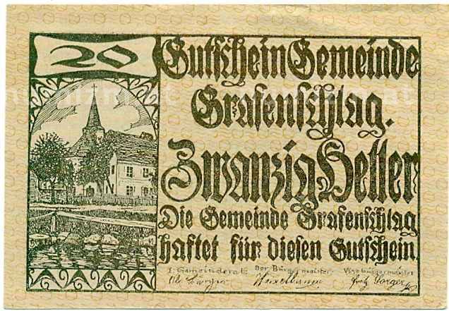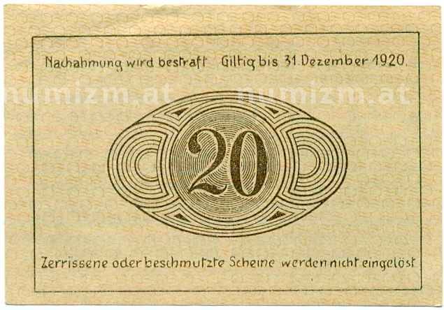 Банкнота 20 геллеров 1920 года Австрия — Коммуна Графеншлаг (Нотгельд) (Артикул: B2-14796): подробные характеристики, качественные фотографии в высоком разрешении, низкая цена.