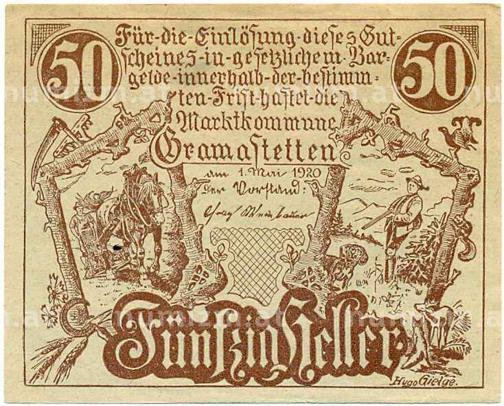 Купить 50 геллеров 1920 года Австрия — Коммуна Грамаштеттен (Нотгельд) по привлекательной цене можно в нашем интернет-магазине — Вам достаточно оформить заказ на сайте. Все монеты, представленные в каталоге, находятся в наличии на нашем складе.