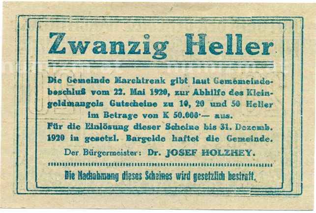 Купить 20 геллеров 1920 года Австрия — Мархтренк (Нотгельд) по привлекательной цене можно в нашем интернет-магазине — Вам достаточно оформить заказ на сайте. Все монеты, представленные в каталоге, находятся в наличии на нашем складе.