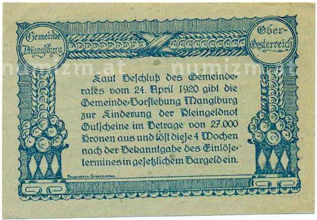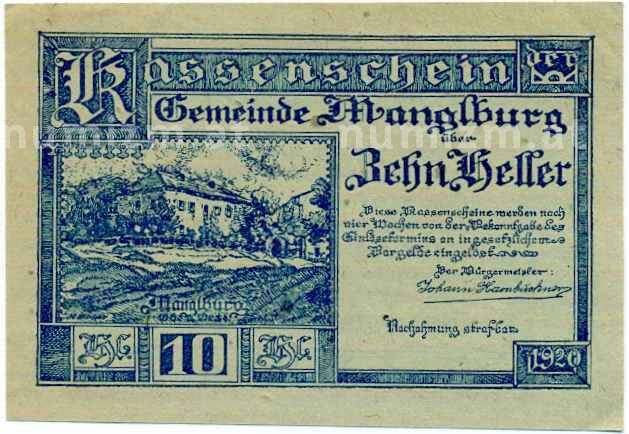 Купить 10 геллеров 1920 года Австрия — Манглбург (Нотгельд) по привлекательной цене можно в нашем интернет-магазине — Вам достаточно оформить заказ на сайте. Все монеты, представленные в каталоге, находятся в наличии на нашем складе.