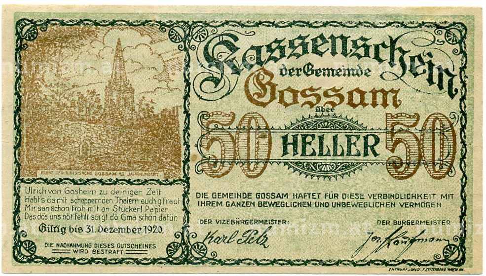 Купить 50 геллеров 1920 года Австрия — Госсам (Нотгельд) по привлекательной цене можно в нашем интернет-магазине — Вам достаточно оформить заказ на сайте. Все монеты, представленные в каталоге, находятся в наличии на нашем складе.