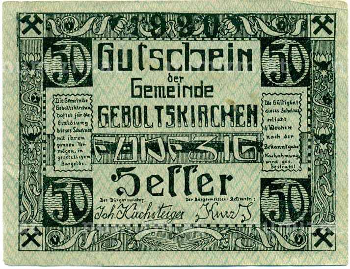 Купить 50 геллеров 1920 года Австрия — Гебольтскирхен (Нотгельд) по привлекательной цене можно в нашем интернет-магазине — Вам достаточно оформить заказ на сайте. Все монеты, представленные в каталоге, находятся в наличии на нашем складе.