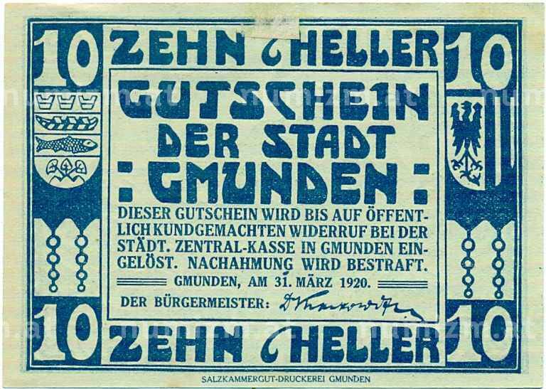 Банкнота 10 геллеров 1920 года Австрия — Гмунден (Нотгельд) (Артикул: B2-14883): подробные характеристики, качественные фотографии в высоком разрешении, низкая цена.