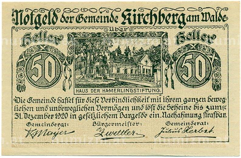 Купить 50 геллеров 1920 года Австрия — Коммуна Кирхберг-на-Вальде (Нотгельд) по привлекательной цене можно в нашем интернет-магазине — Вам достаточно оформить заказ на сайте. Все монеты, представленные в каталоге, находятся в наличии на нашем складе.