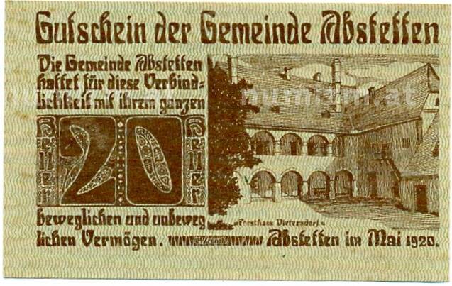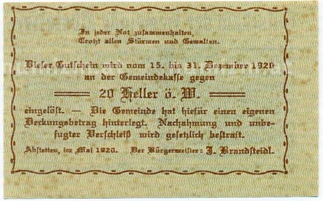 Купить 20 геллеров 1920 года Австрия — Абстеттен (Нотгельд) по привлекательной цене можно в нашем интернет-магазине — Вам достаточно оформить заказ на сайте. Все монеты, представленные в каталоге, находятся в наличии на нашем складе.
