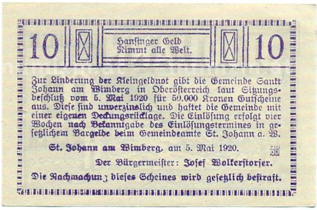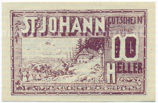Купить 10 геллеров 1920 года Австрия — Коммуна Санкт-Йохан-на-Вимберге (Нотгельд) по привлекательной цене можно в нашем интернет-магазине — Вам достаточно оформить заказ на сайте. Все монеты, представленные в каталоге, находятся в наличии на нашем складе.