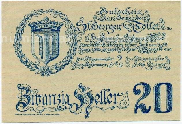 20.01.2025Интернет магазин «Нумизмат» предлагает приобрести 20 геллеров 1920 года Австрия — Община Санкт-Георген-ам-Толлет (Нотгельд).