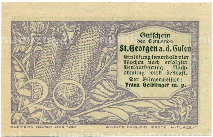 Купить 20 геллеров 1920 года Австрия — Санкт-Георген-ан-дер-Гузен (Нотгельд) по привлекательной цене можно в нашем интернет-магазине — Вам достаточно оформить заказ на сайте. Все монеты, представленные в каталоге, находятся в наличии на нашем складе.