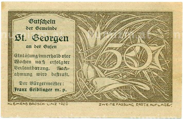 Купить 50 геллеров 1920 года Австрия — Санкт-Георген-ан-дер-Гузен (Нотгельд) по привлекательной цене можно в нашем интернет-магазине — Вам достаточно оформить заказ на сайте. Все монеты, представленные в каталоге, находятся в наличии на нашем складе.