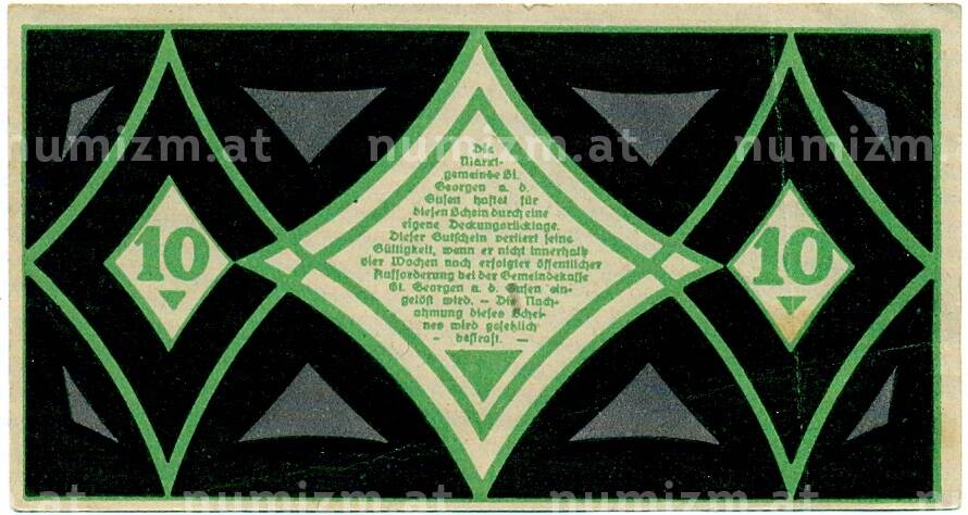 Купить 10 геллеров 1920 года Австрия — Санкт-Георген-ан-дер-Гузен (Нотгельд) по привлекательной цене можно в нашем интернет-магазине — Вам достаточно оформить заказ на сайте. Все монеты, представленные в каталоге, находятся в наличии на нашем складе.