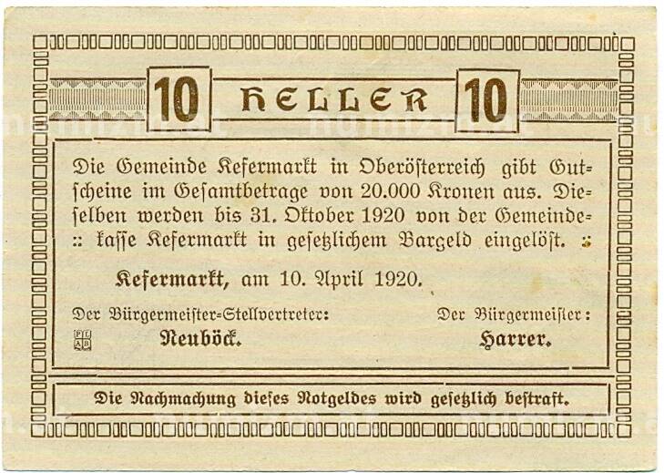 Купить 10 геллеров 1920 года Австрия — Коммуна Кефермаркт (Нотгельд) по привлекательной цене можно в нашем интернет-магазине — Вам достаточно оформить заказ на сайте. Все монеты, представленные в каталоге, находятся в наличии на нашем складе.