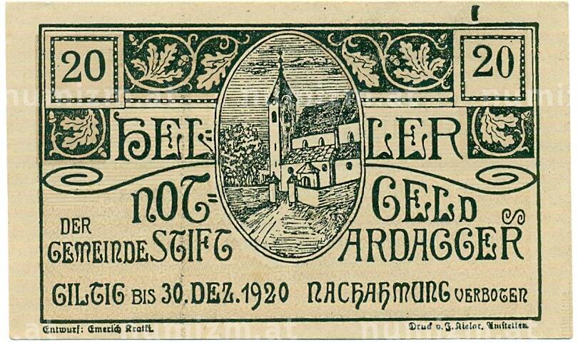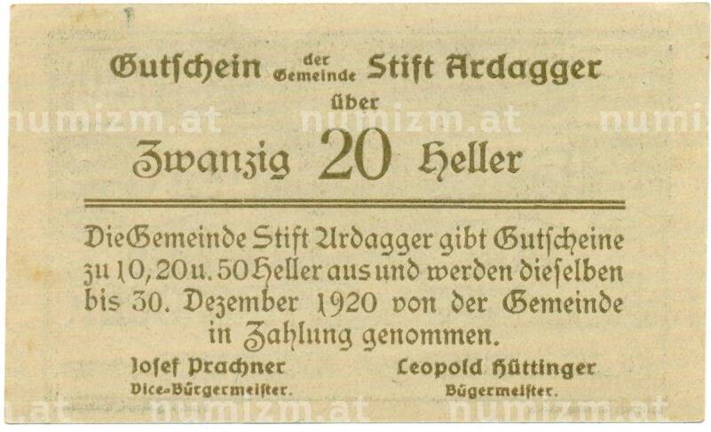 Купить 20 геллеров 1920 года Австрия — Ардаггер-Штифт (Нотгельд) по привлекательной цене можно в нашем интернет-магазине — Вам достаточно оформить заказ на сайте. Все монеты, представленные в каталоге, находятся в наличии на нашем складе.