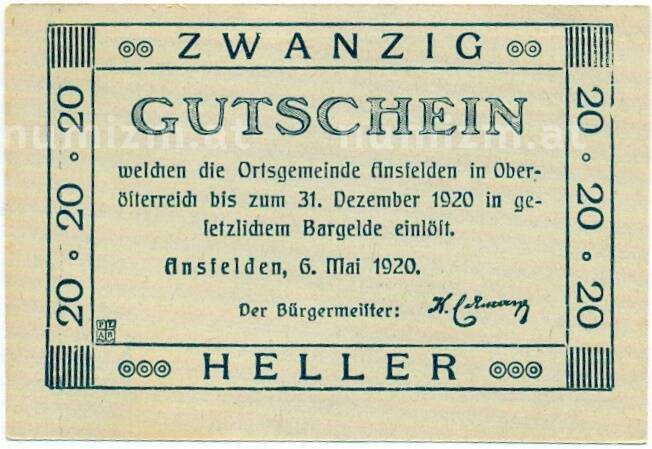 Купить 20 геллеров 1920 года Австрия — Коммуна Ансфельден (Нотгельд) по привлекательной цене можно в нашем интернет-магазине — Вам достаточно оформить заказ на сайте. Все монеты, представленные в каталоге, находятся в наличии на нашем складе.