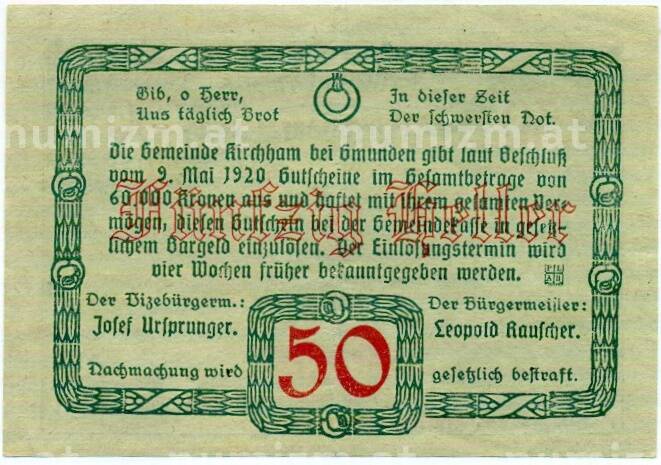 Купить 50 геллеров 1920 года Австрия — Кирххам (Нотгельд) по привлекательной цене можно в нашем интернет-магазине — Вам достаточно оформить заказ на сайте. Все монеты, представленные в каталоге, находятся в наличии на нашем складе.