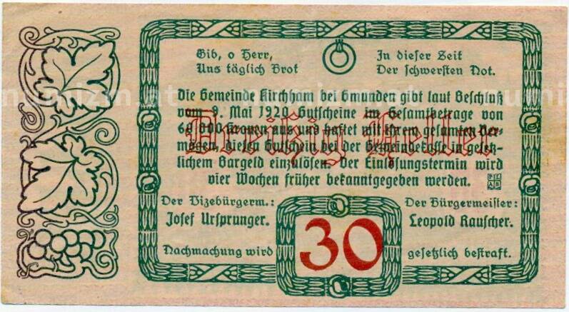 Купить 30 геллеров 1920 года Австрия — Кирххам (Нотгельд) по привлекательной цене можно в нашем интернет-магазине — Вам достаточно оформить заказ на сайте. Все монеты, представленные в каталоге, находятся в наличии на нашем складе.