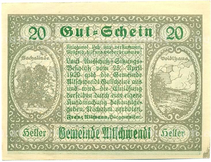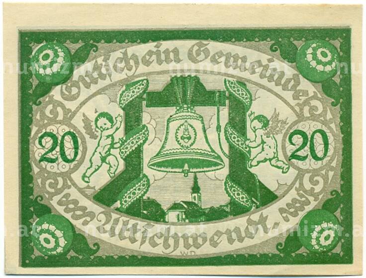 Купить 20 геллеров 1920 года Австрия — Коммуна Альтшвендт (Нотгельд) по привлекательной цене можно в нашем интернет-магазине — Вам достаточно оформить заказ на сайте. Все монеты, представленные в каталоге, находятся в наличии на нашем складе.