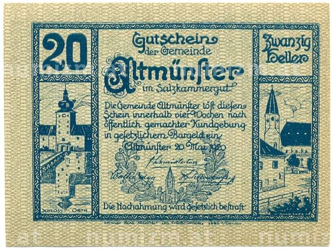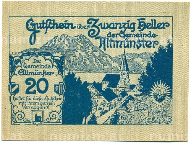 Купить 20 геллеров 1920 года Австрия — Альтмюнстер (Нотгельд) по привлекательной цене можно в нашем интернет-магазине — Вам достаточно оформить заказ на сайте. Все монеты, представленные в каталоге, находятся в наличии на нашем складе.
