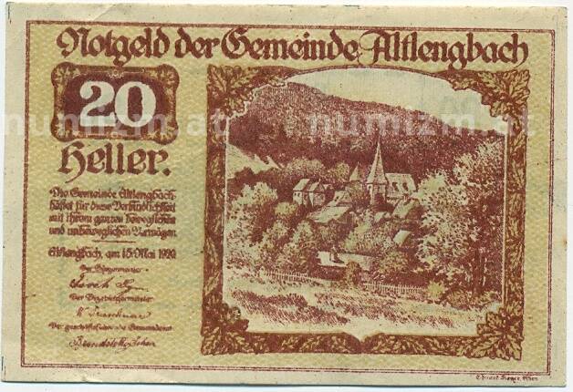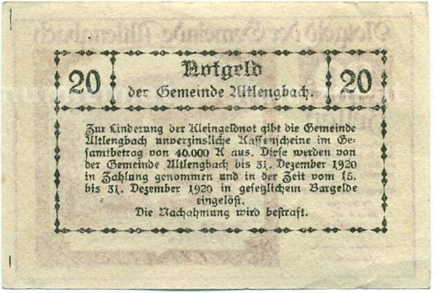 Купить 20 геллеров 1920 года Австрия — Коммуна Альтленгбах (Нотгельд) по привлекательной цене можно в нашем интернет-магазине — Вам достаточно оформить заказ на сайте. Все монеты, представленные в каталоге, находятся в наличии на нашем складе.