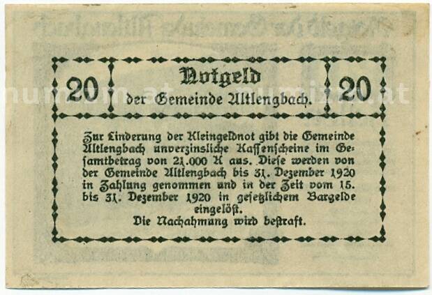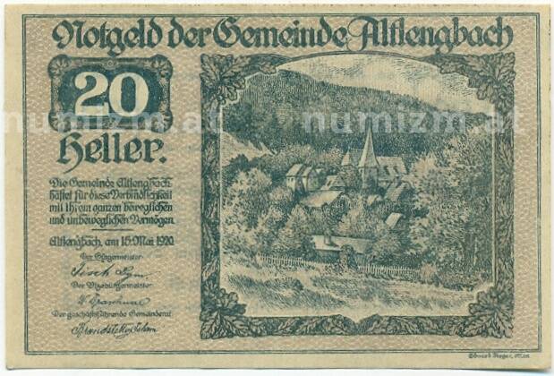 Банкнота 20 геллеров 1920 года Австрия — Коммуна Альтленгбах (Нотгельд) (Артикул: B2-15228): подробные характеристики, качественные фотографии в высоком разрешении, низкая цена.