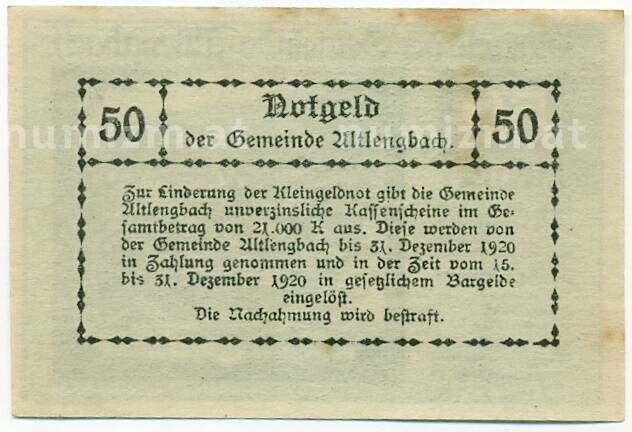 Банкнота 50 геллеров 1920 года Австрия — Коммуна Альтленгбах (Нотгельд) (Артикул: B2-15230): подробные характеристики, качественные фотографии в высоком разрешении, низкая цена.